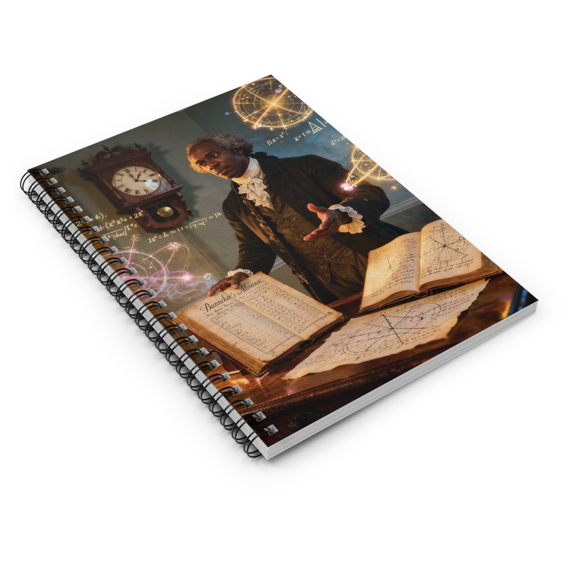 A compact ruled spiral notebook that blends old-world curiosity with modern note-taking. The front cover shows the thoughtful scholar Benjamin Banneker in a richly detailed study showcasing his inventions, the striking wall clock and the farmer's almanec. Inside, 118 lined pages of smooth 90 gsm paper make drafting ideas, lecture notes, and daily lists feel deliberate and satisfying. The metal spiral lets the pages flip fully flat or fold back for one-handed writing, while a discreet document pocket in the back cover keeps loose notes, receipts, or reference scraps close at hand. At 6" x 8", it slips into a satchel or backpack and becomes a steady companion for study sessions, journaling evenings, or planning bursts between meetings.