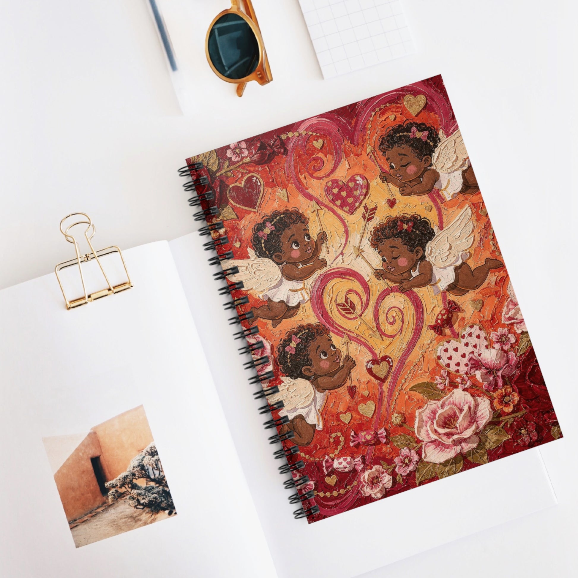 A warm, joyful spiral notebook that invites everyday notes, sketches, and love letters. The front cover features playful cherubic figures, swirling hearts, and a lush floral border in rich reds and pinks — a small canvas that sparks whimsical, tender moments. At 6 x 8 inches with 118 ruled pages on smooth 90gsm paper, this notebook feels substantial yet portable. Metal spiral binding lays flat for comfortable writing and lets you remove pages cleanly. A handy document pocket inside the back cover keeps loose papers, mementos, or receipts organized. Use it for journaling, planning, doodling, or keeping lists; the cover art keeps the mood bright and affectionate every time you open it.